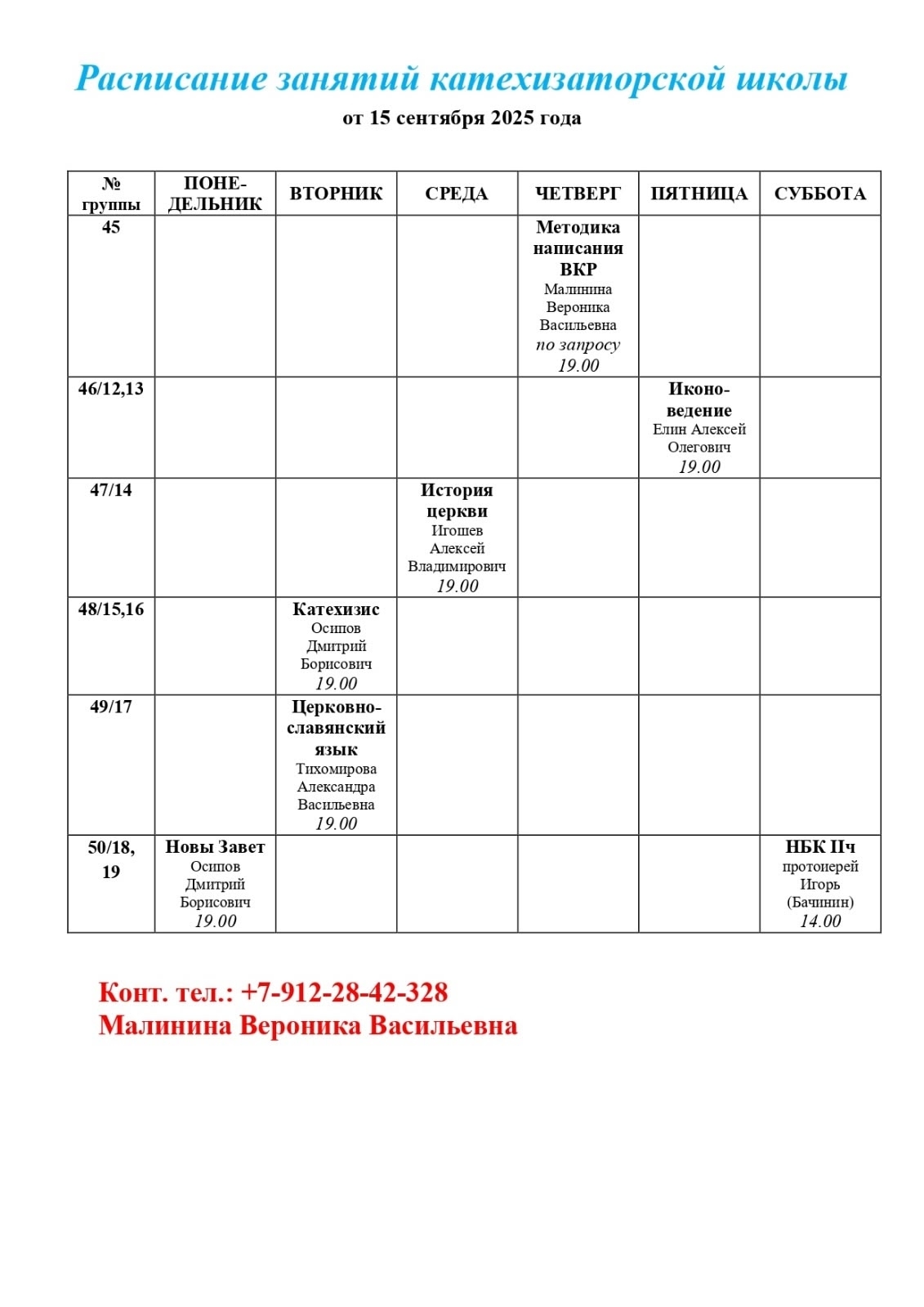 Расписание занятий катехизаторской школы для взрослых на 2025 год!