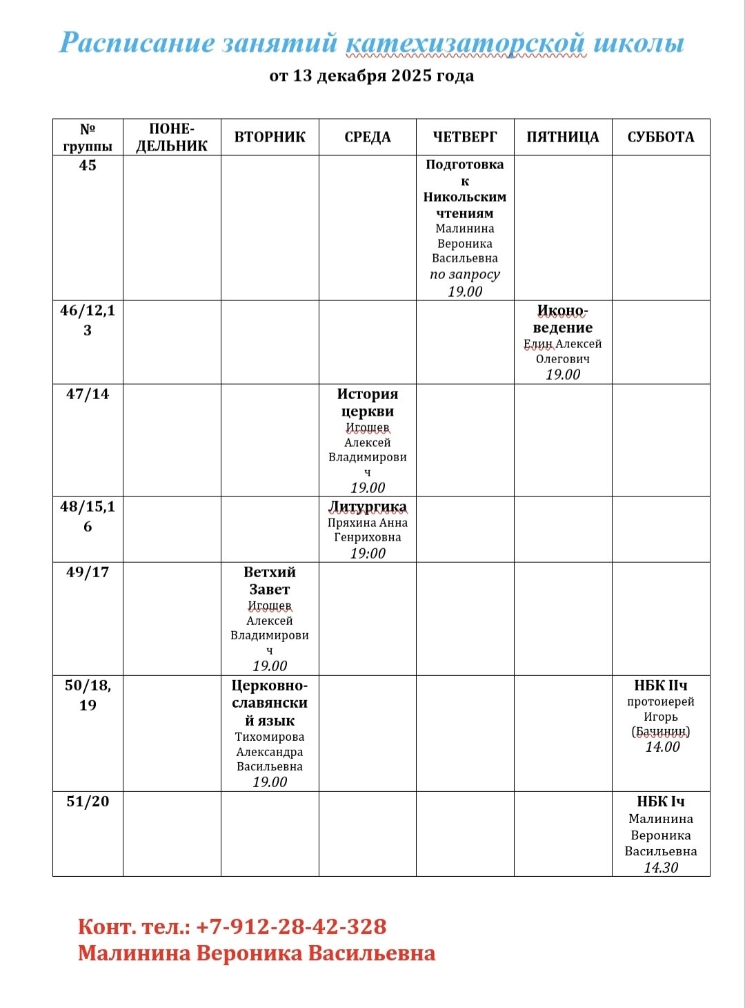 Актуальное расписание занятий катехизаторской школы